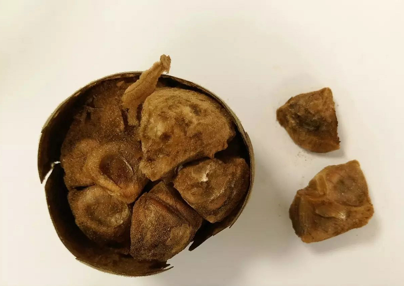 【性状】 本品呈卵形、椭圆形或球形,长4.5~8.5cm,直径3.5~6cm。表面褐色、黄褐色或绿褐色,有深色斑块和黄色柔毛,有的具6~11条纵纹。顶端有花柱残痕,基部有果梗痕。体轻,质脆,果皮薄,易破。果瓤(中、内果皮)海绵状,浅棕色。种子扁圆形,多数,长约1.5cm,宽约1.2cm;浅红色至棕红色,两面中间微凹陷,四周有放射状沟纹,边缘有槽。气微,味甜。