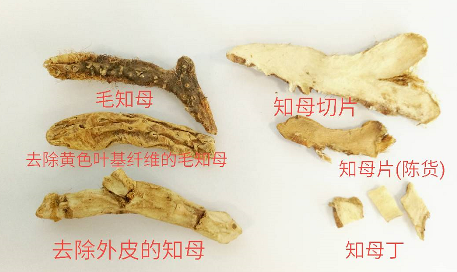本品为百合科植物知母Anemarrhena asphodeloides Bge.的干燥根茎。春、秋二季采挖,除去须根和泥沙,晒干,习称"毛知母";或除去外皮,晒干。