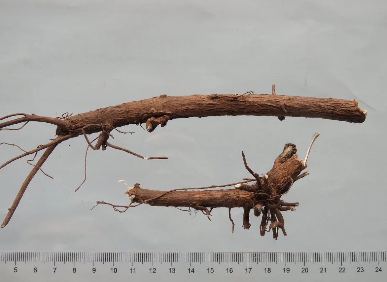 【性状】 本品根茎呈结节状不规则圆柱形,直径1.4~4.2cm。根呈圆柱形 ,多扭曲,长3.5~12cm,直径0.3~1.5cm;表面灰褐色或黑褐色,粗糙 ,有细纵沟和皱纹 ,皮较薄,有的剥落 ,剥落处呈灰黄色 。质硬,断面黄白色,纤维性 。有特异香气,味微辛、稍苦 、涩。