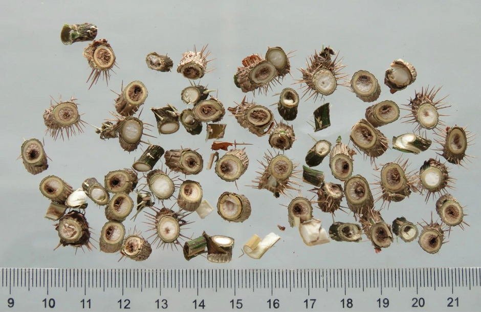 本品茎呈长圆柱形 ,多分枝 ,长短不一,直径0.5~2cm。表面浅灰色 ,老枝灰褐色,具纵裂沟,无刺;幼枝黄褐色 ,密生细刺。质坚硬 ,不易折断 ,断面皮部薄,黄白色,木部宽广 ,淡黄色,中心有髓。气微 ,味微辛。