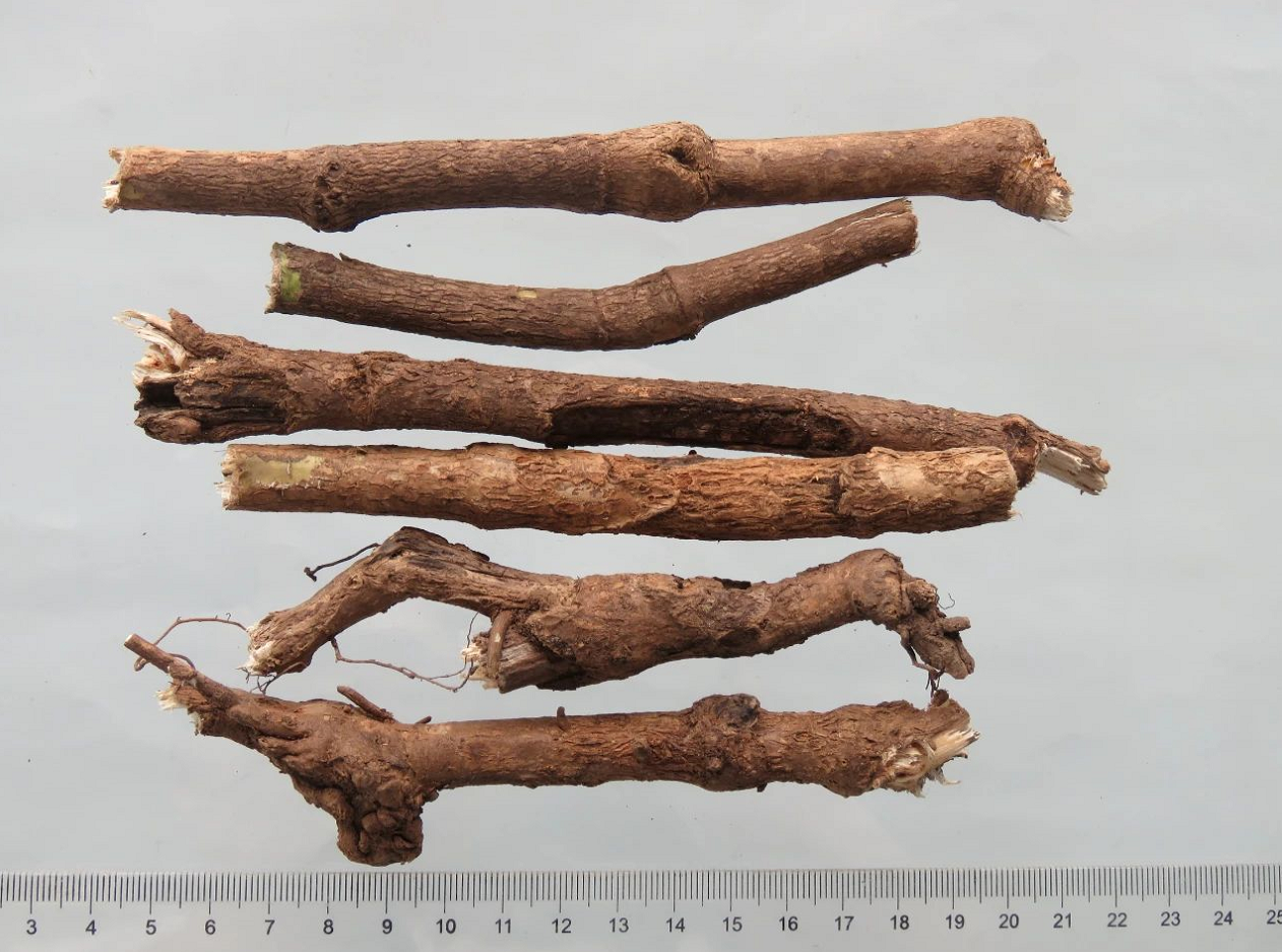 【性状】 本品呈类圆形或不规则形的厚片 。根和根茎外表皮灰褐色或黑褐色,粗糙,有细纵沟和皱纹,皮较薄,有的剥落,剥落处呈灰黄色;茎外表皮浅灰色或灰褐色,无刺 ,幼枝黄褐色,密生细刺。切面黄白色 ,纤维性 ,茎的皮部薄,木部宽广,中心有髓。根和根茎有特异香气,味微辛、稍苦、涩;茎气微,味微辛 。